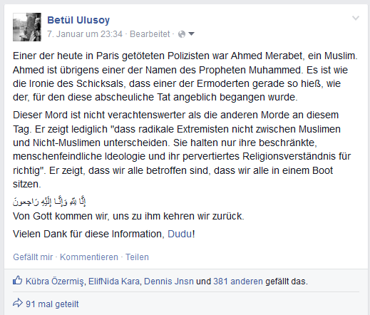 Hallo liebe Betül, ich möchte Dich daran erinnern, dass Du in einem anderen Artikel Deine deutschen Mitbürger zur Solidarität gegen Ausländerfeindlichkeit aufrufst – und zwar richtiger Weise. Ausserdem: Du hast Dich ja sowieso schon ganz freiwillig positioniert, ich verstehe daher nicht ganz, weshalb Du es ablehnst, wenn Deine Meinung auch innerhalb eines Kollektivs Ausdruck findet. Und zu guter Letzt ist eine Distanzierung von Seiten (eines möglichst großen Teils) der muslimischen Community auch deswegen wichtig, weil diese Taten – auch wenn sie in verschiedenen sozialen Problemen begründet sind – sicherlich von der Motivation getrieben sind, Anerkennung zu finden (Wenigstens posthum). Es ist meiner Meinung nach auch ganz besonders wichtig, dass diese Position nicht als Sammelsurium von Einzelmeinungen interpretierbar ist, darauf würde Deine Wunsch, Dich als Mensch und nicht als Muslimin zu distanzieren , aber abzielen.